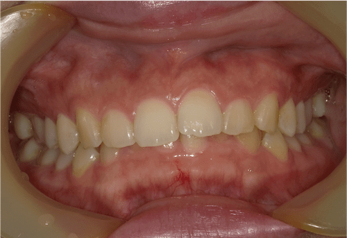 上下に叢生が見られる。下顎前歯を上顎前歯が大きく覆っている。上下顎前歯を圧下し過蓋咬合の改善、IPRを加えて叢生の改善を計画し、インビザラインで治療を行う事とした
