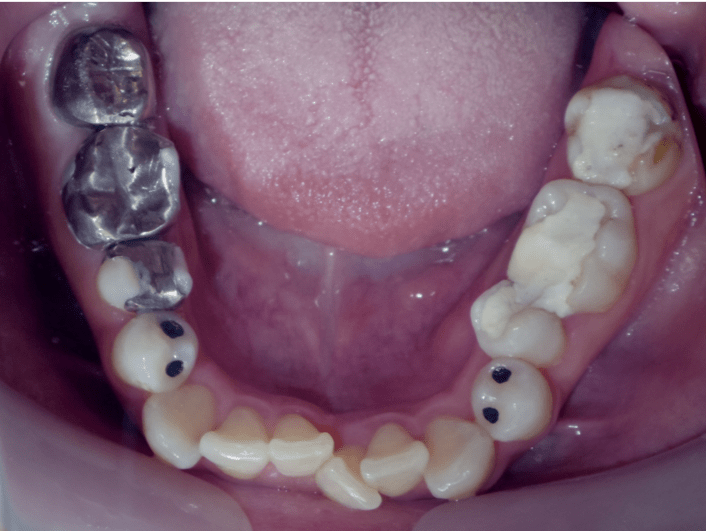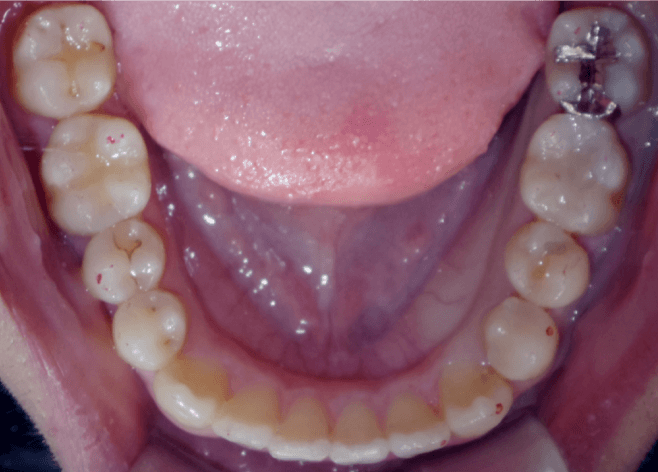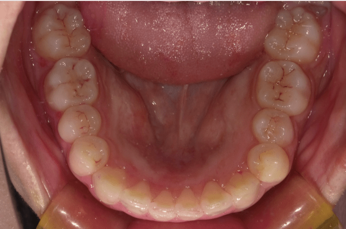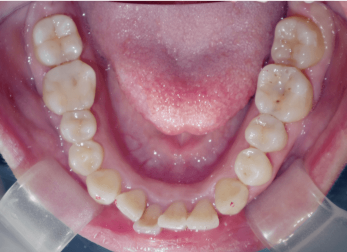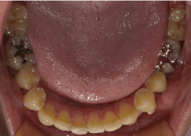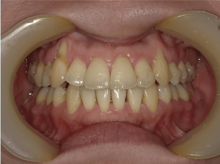 上下の軽度の叢生があり、上顎に内側に大きく入り込んだ歯牙がある。補綴が多く、IPRでスペースを確保できるのでインビザラインでの治療が可能と判断した。